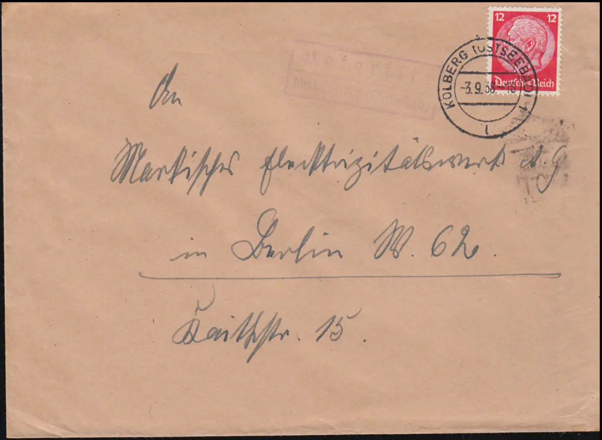 Landpost Peterfitz über Kolberg Ostseebad 3.9.1938