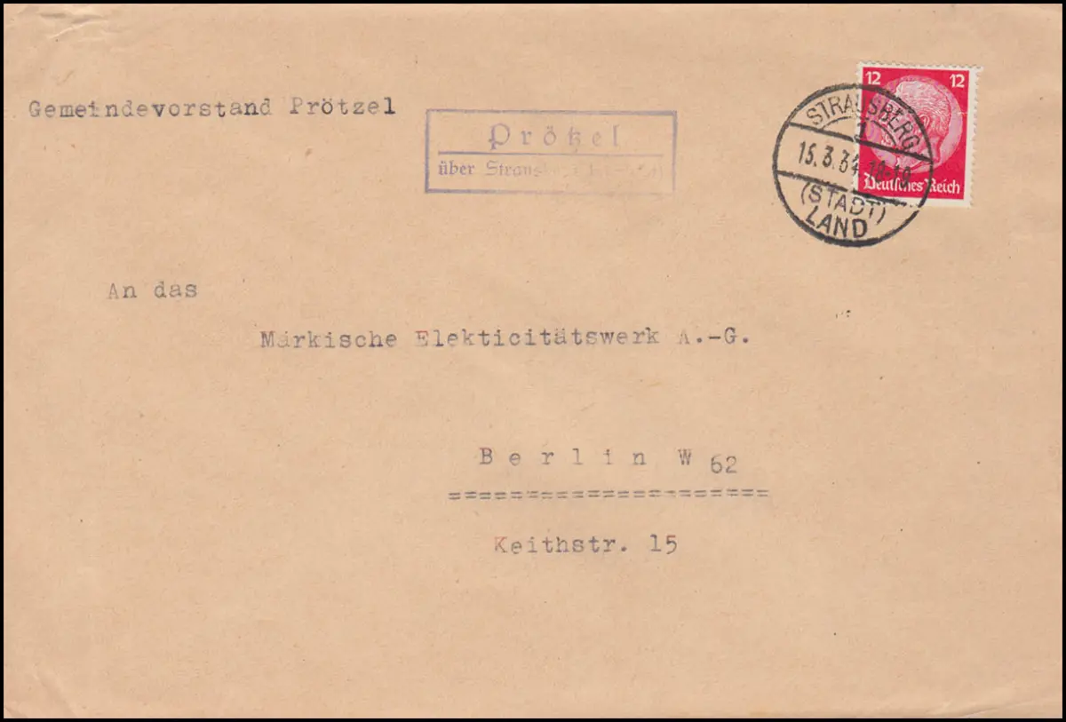 Landpost Prötzel über Strausberg (Stadt) Land, 15.3.1934