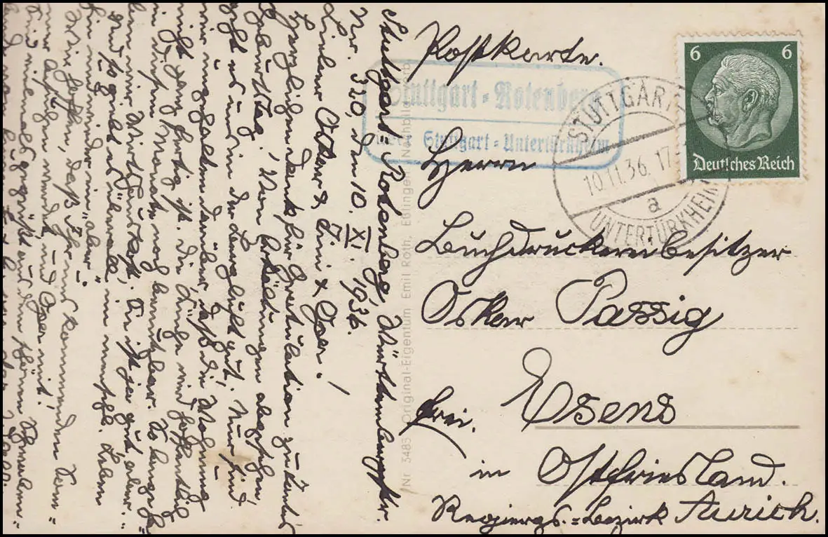 Landpost STUTTGART Rotenberg sur HUNTÜRKHEIM 10.11.36 sur AK Württemberg