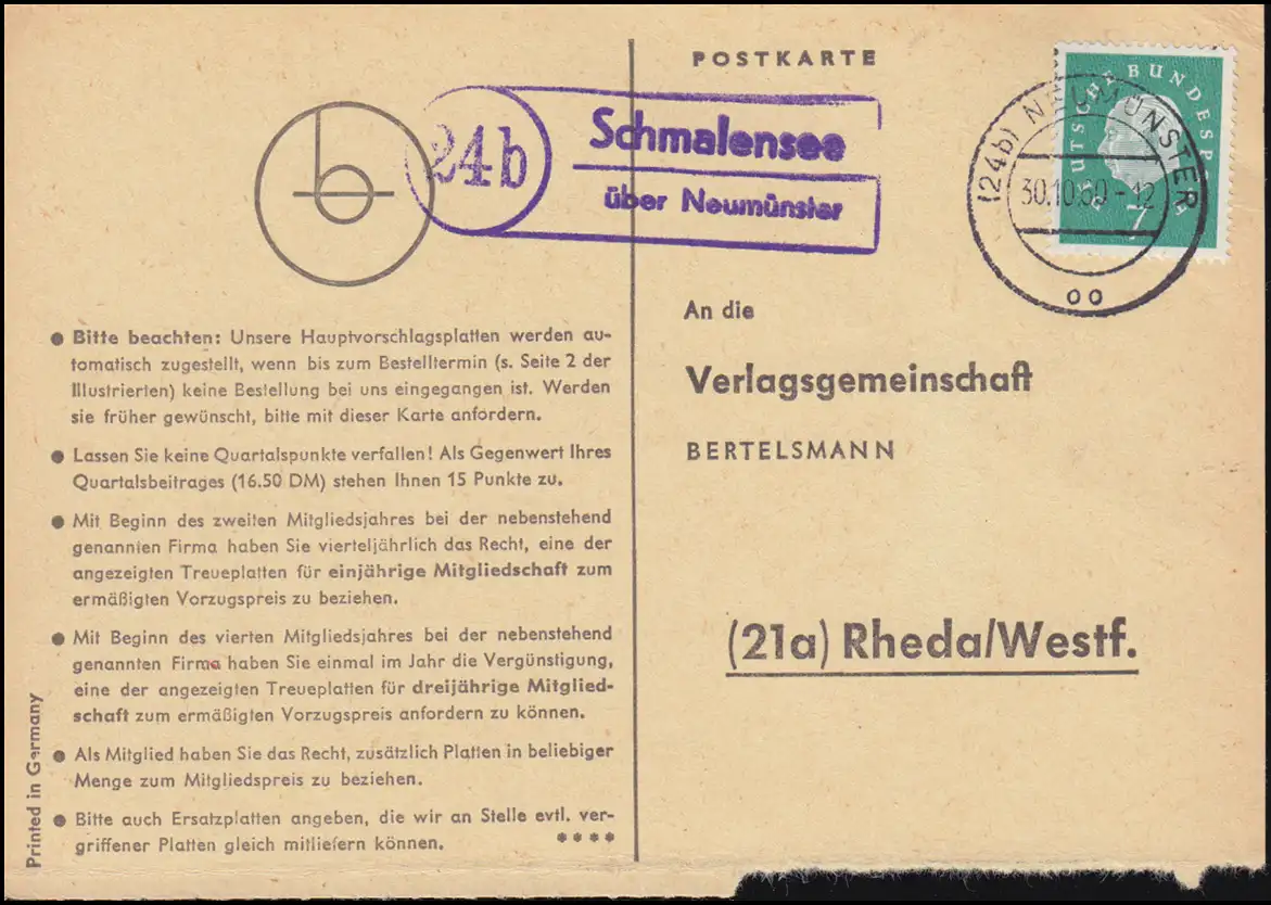 Landpost Schmalensee via NEUMCHUNSTER 30.10.1960 sur carte postale vers Rheda/Westf.