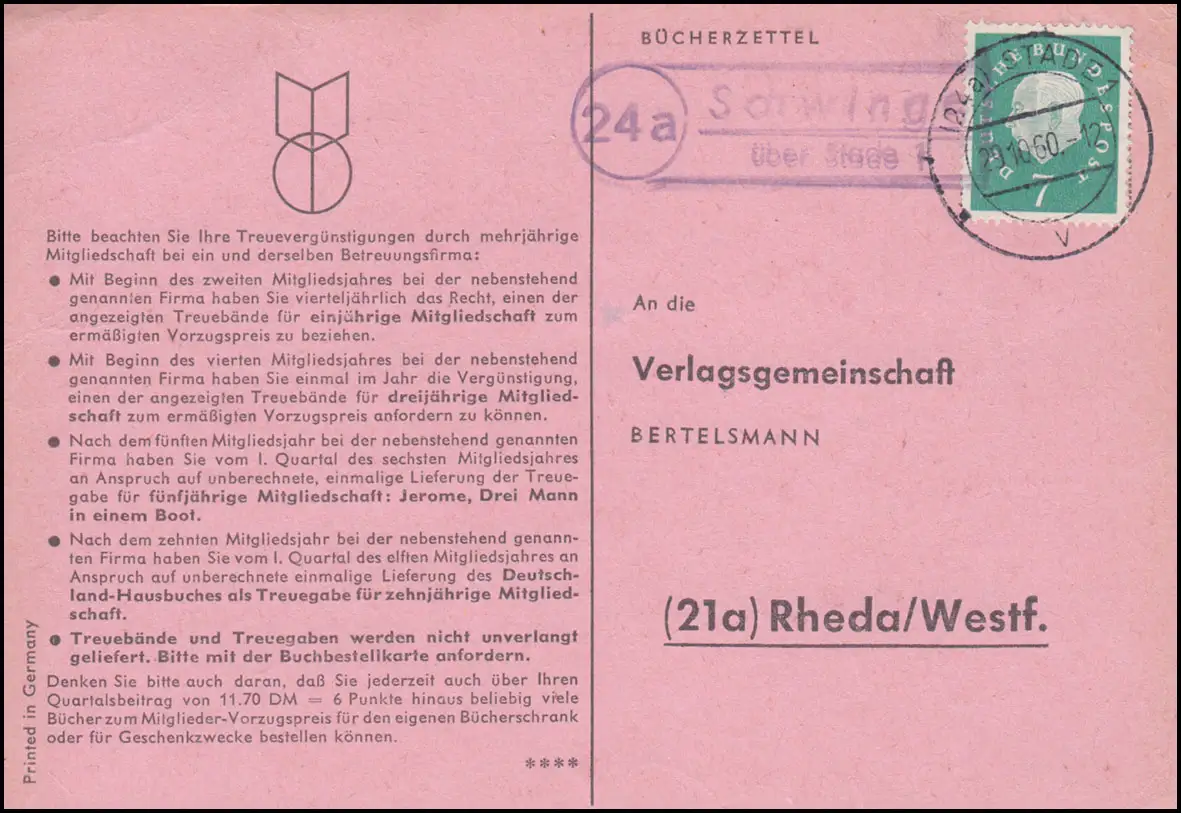 Landpost Schwinge via STADE 29.10.1960 sur carte postale vers Rheda/Westf.