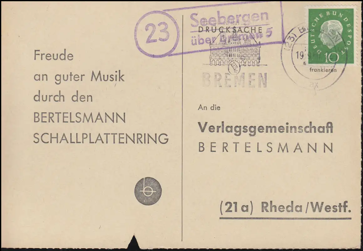 Landpost Seebergen sur BREMEN 5 - 19.9.1960 sur carte postale vers Rheda/Westfalen