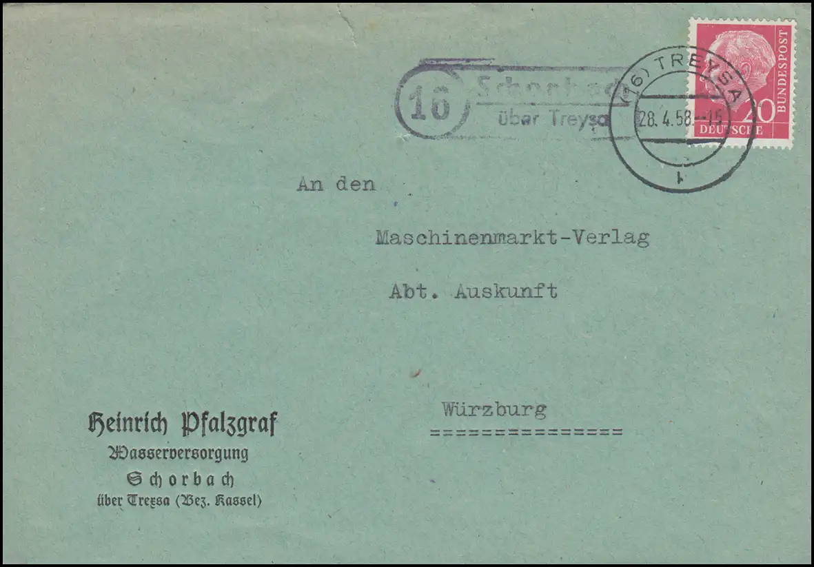 Landpost Shorbach sur TREYSA 28.4.1958 sur lettre de l'approvisionnement en eau