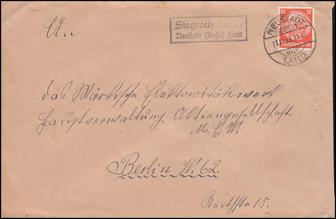 Landpost Siegrothsbruch sur NEUSTADT (DOSSE) LAND 11.12.33, Lettre à Berlin