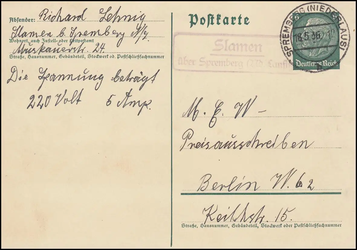 Landpost Slamen sur SPREMBERG (NIEDLAUSWEICH) 18.5.36 sur carte postale P 226I