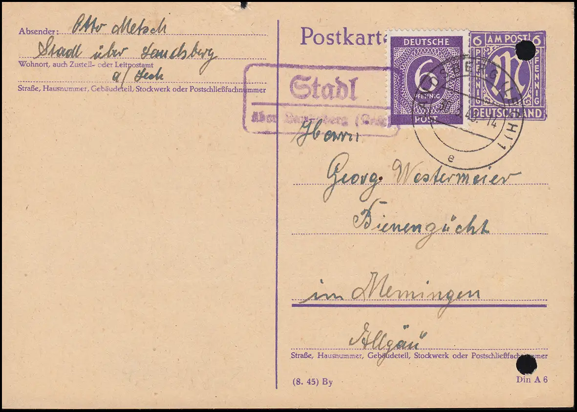 Pays-Bas: Stadl via LANDSBERG (LECH) 30.5.46 sur carte postale P 903 avec supplément