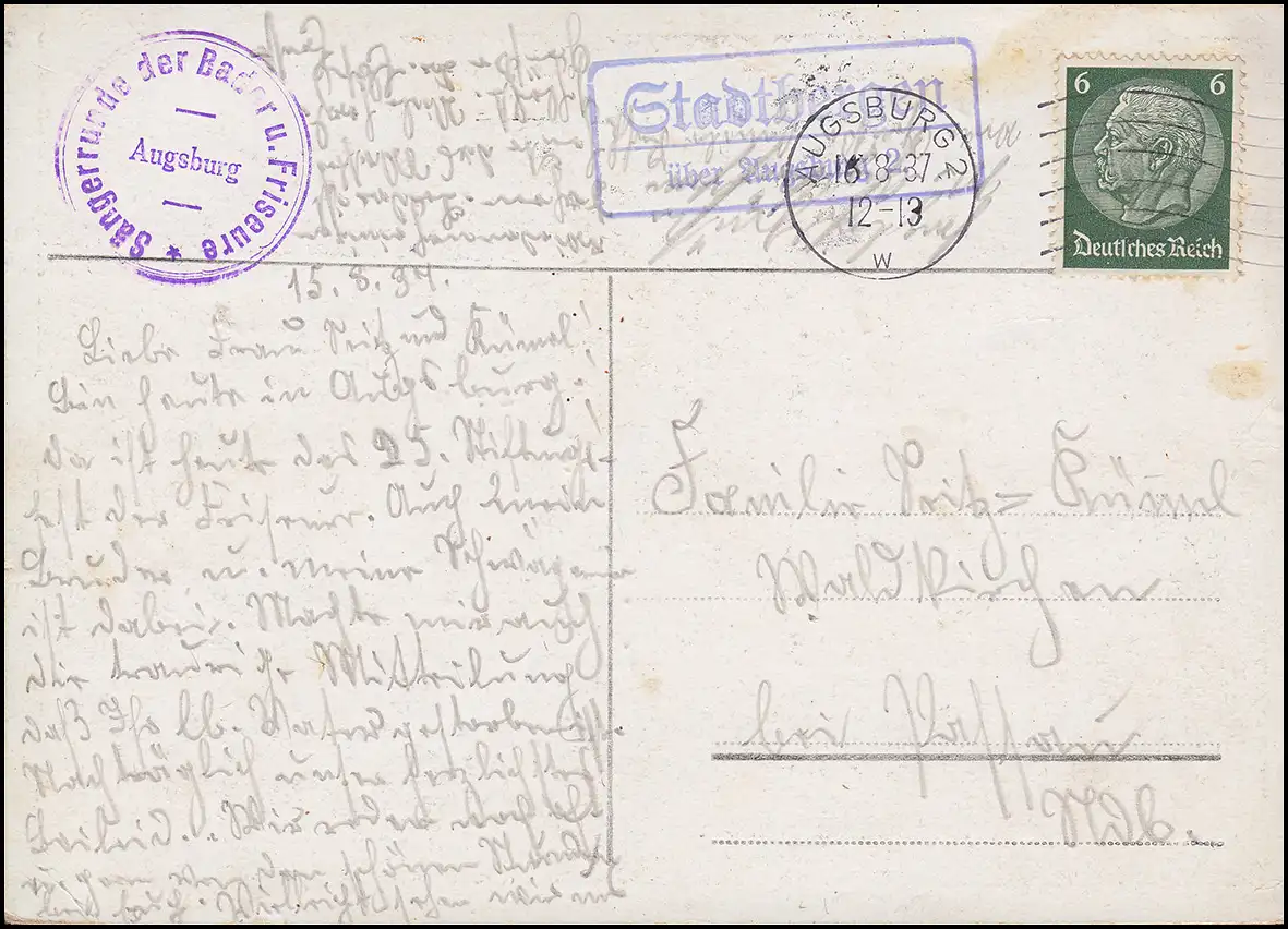 Landpost Stadtbergen sur AUGBURG 2 - 16.8.37 sur carte