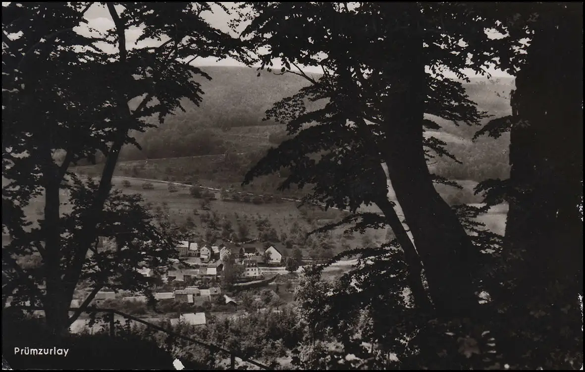 Tampon spécial (22b) BITBURG (EIFEL) Bierstadt 12.8.58, carte de vue Panorama de Prümzurlay / Gasthof "Zur Burg" - Prumzurley bei Irrel, Kreis Bitburg, arrondissement de Trèves examen: original Référence produit: 00000000033122