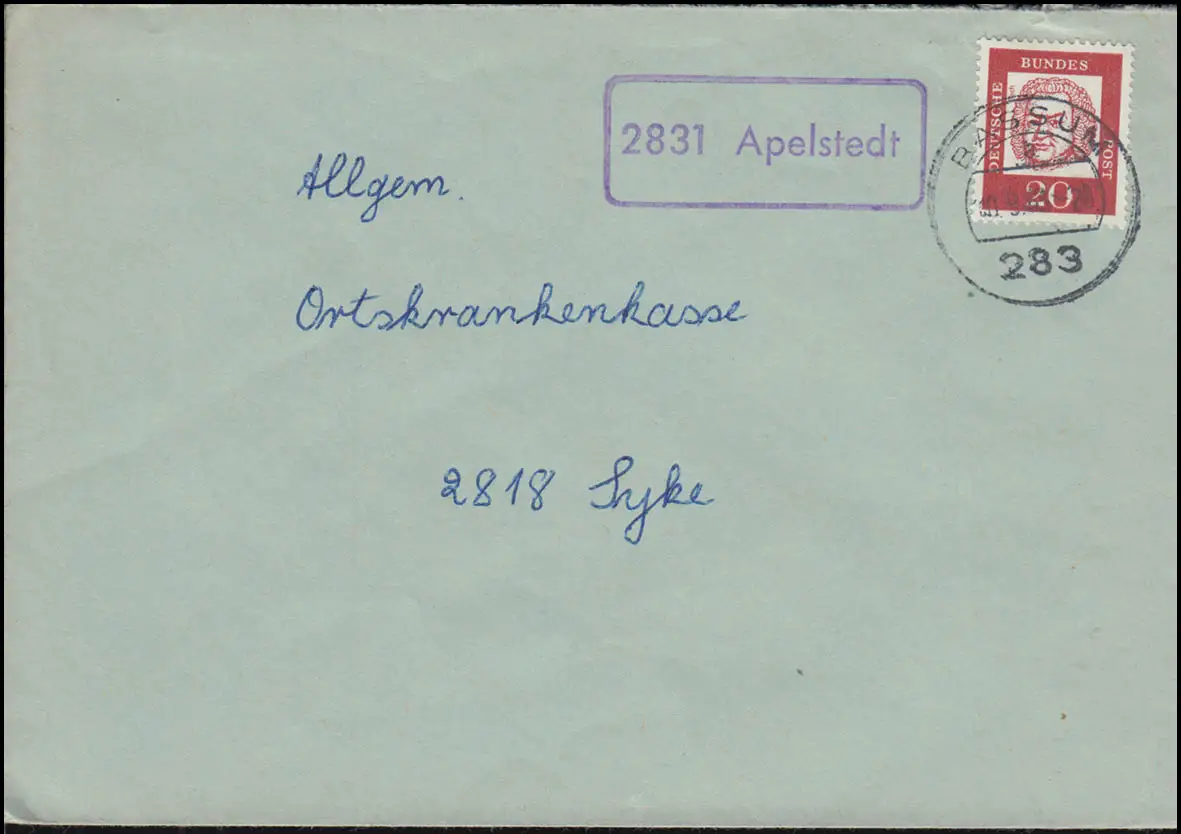 Le temple de Landpost 2831 Apelstedt sur lettre BASSUM 1963 à Syke