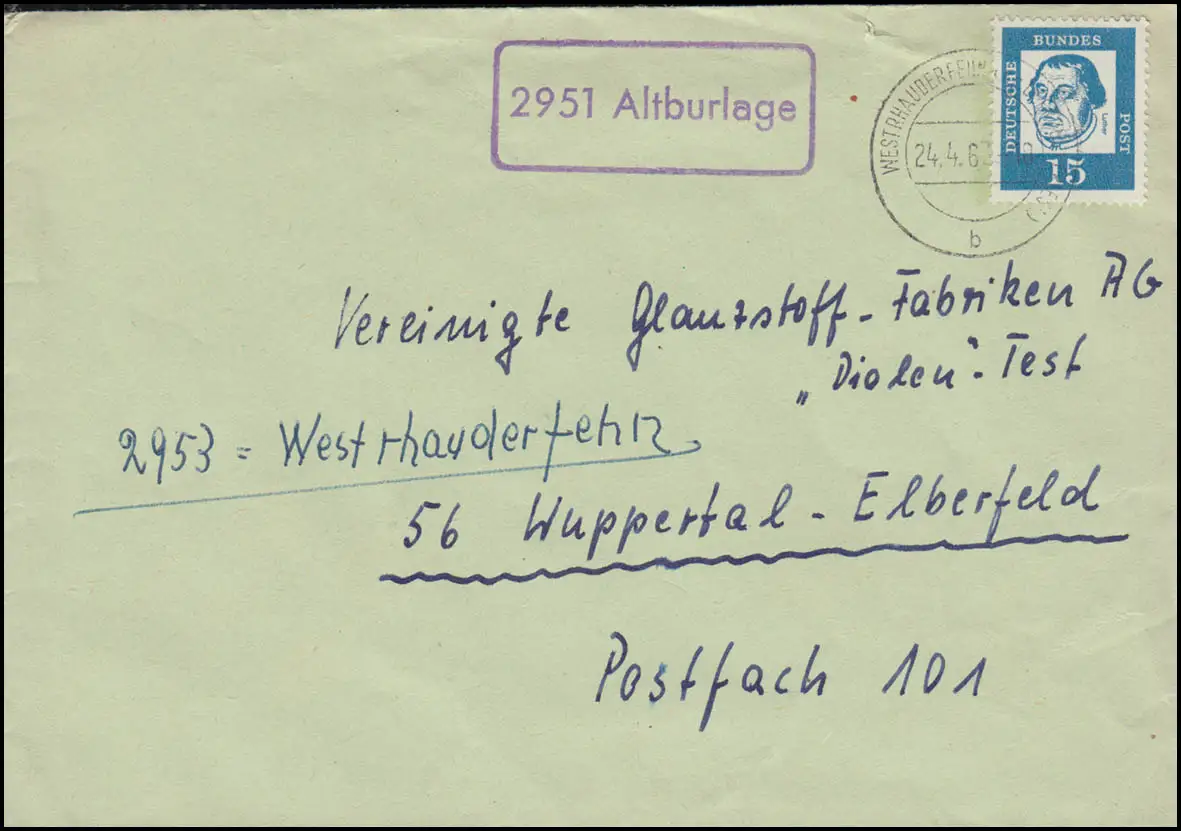 Temple de Landpost 2951 Altburlage sur l'impression de lettres WESTRHAUDERFEHN 24.4.1963