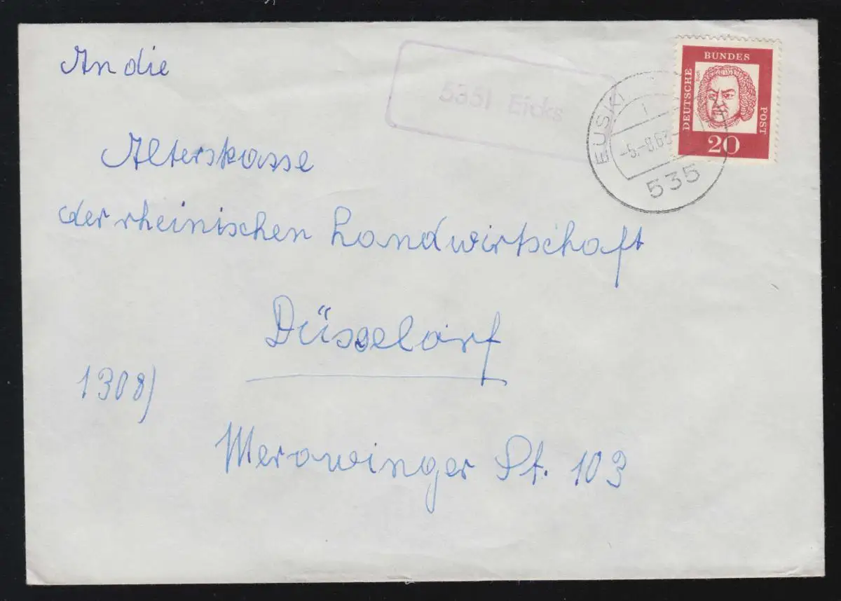 Le temple de la poste de campagne 5351 Eicks sur lettre EUSKIRCHEN 5.8.1963 à Düsseldorf