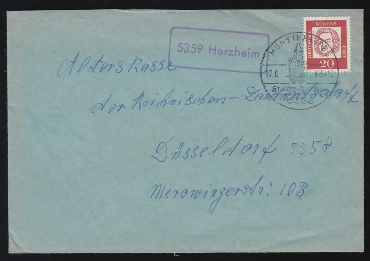 Temple de Landpost 5359, Harzheim sur lettre SSt MÜNSTEREIFEL Kneipp-Heilbad 17.8.63