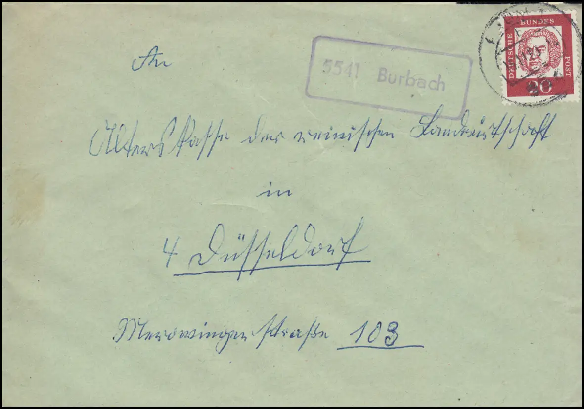 Temple de la poste de campagne 5541 Burbach sur lettre PRUM 15.11.1963