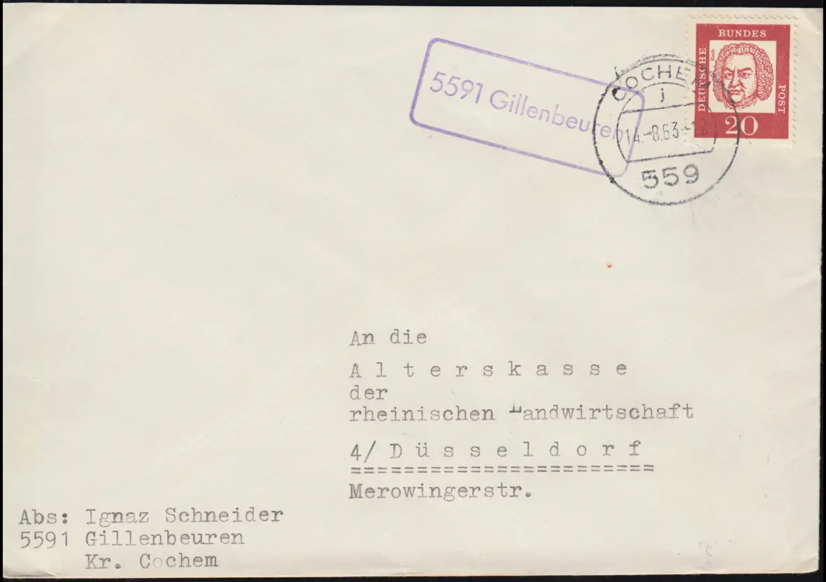 Temple de Landpost 5591 Gillenbeuren sur lettre COCHEM 14.8.1963 à Düsseldorf