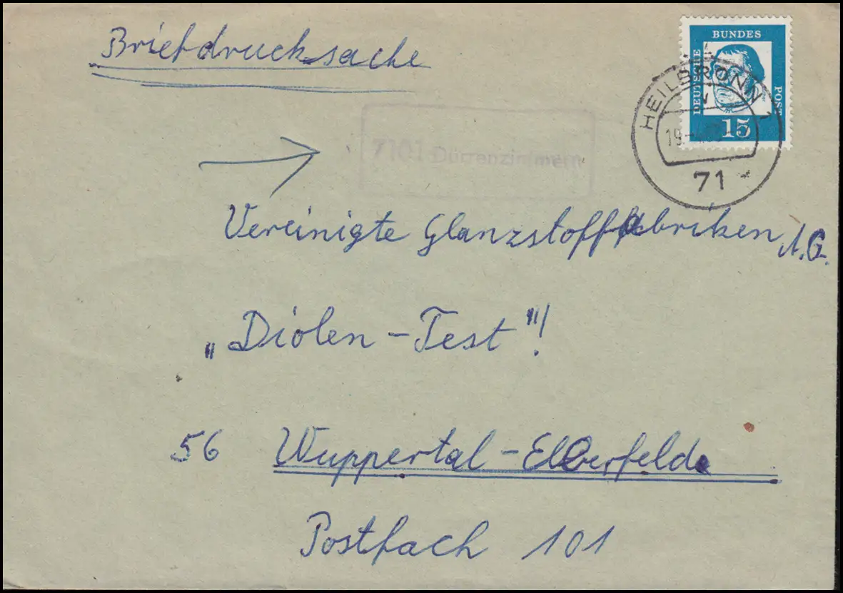 Temple de la poste de campagne 7101 salles de sécheresse sur lettre HEILBRONN 19.4.63 à Wuppertal