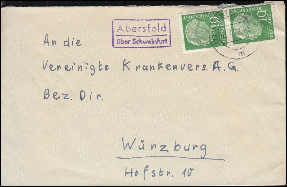 Le temple de Landpost Abersfeld sur SCHWEINFURT 1.7.1958 sur lettre à Würzburg