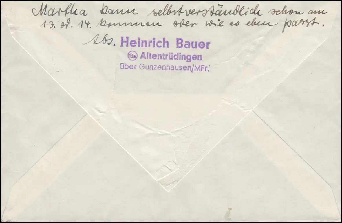 Le temple de la poste de Landpost Altentrudingen sur GUNZENHAUSEN sur lettre vers 1960