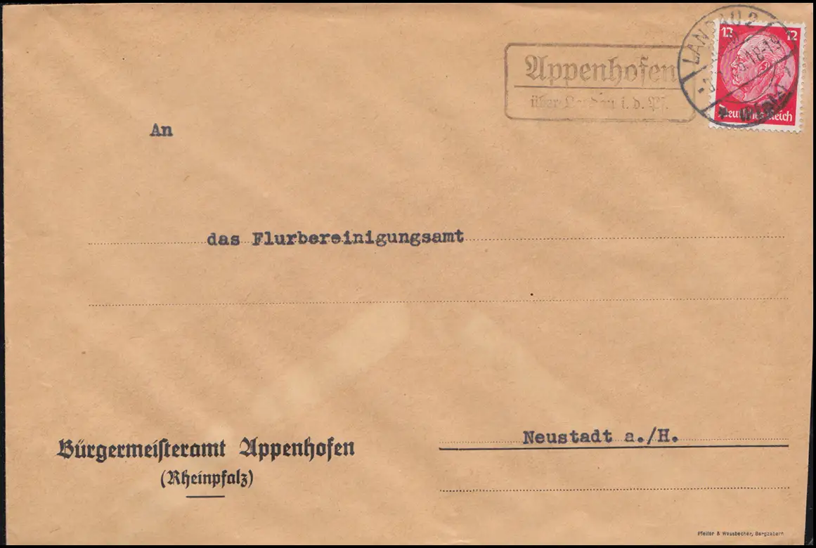 Temple de Landpost Appenhofen sur LANDAU 2 PAYS (Palatinat) 1935 Lettre pour Neustadt