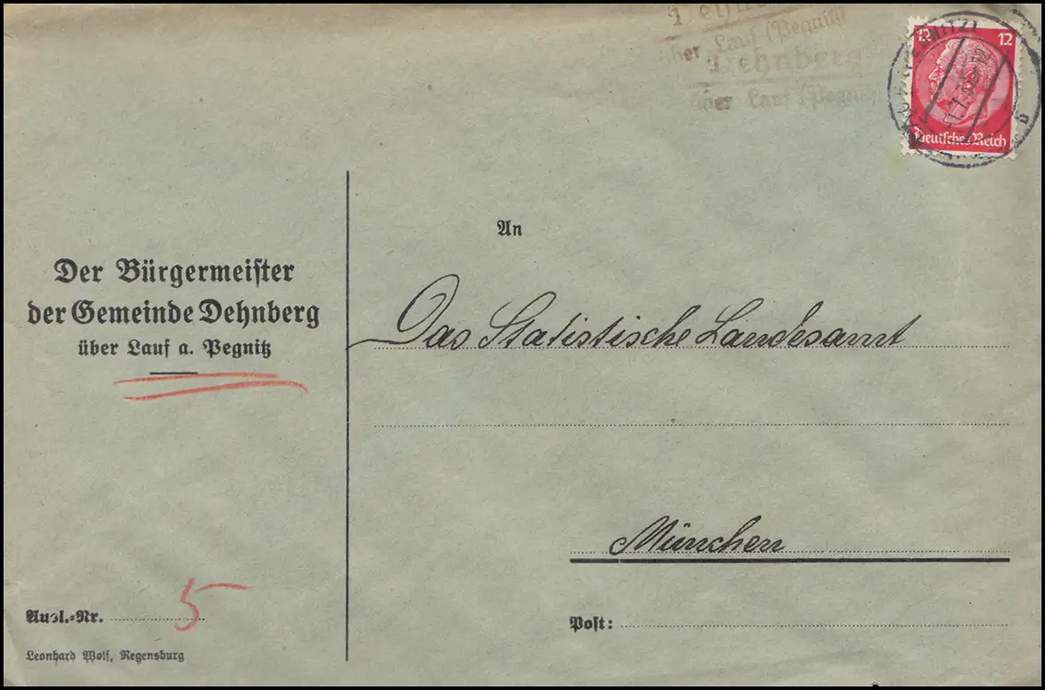 Le temple de Dehnberg sur le long terme (PEGNITZ) 1.7.1937 sur lettre à Munich