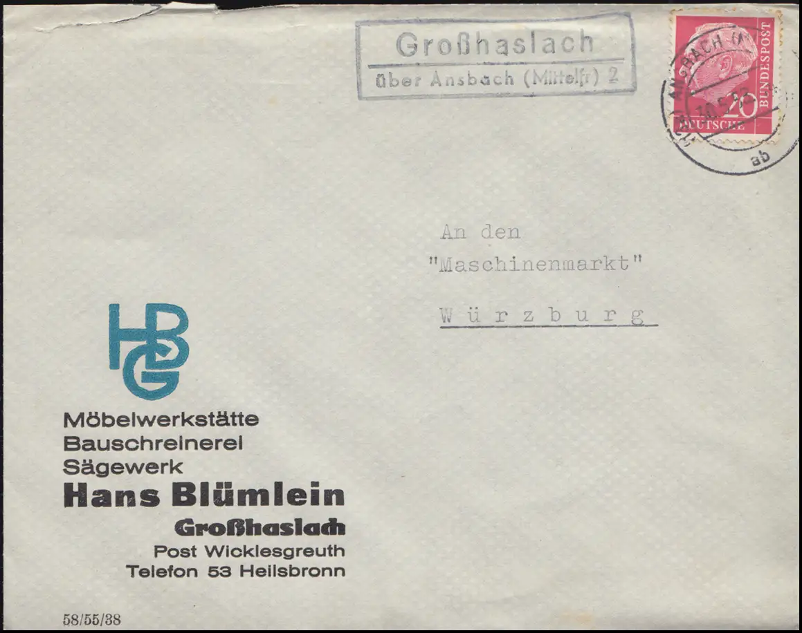Le temple de Landpost de Grosshaslach sur Ansbach 30.5.1958 sur lettre à Würzburg