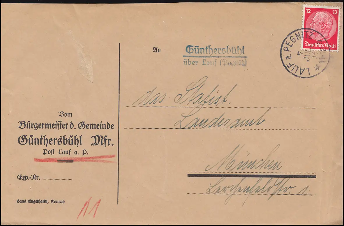 Le temple de Günthersbühl sur le long terme (PEGNITZ) 7.7.36 sur lettre à Munich