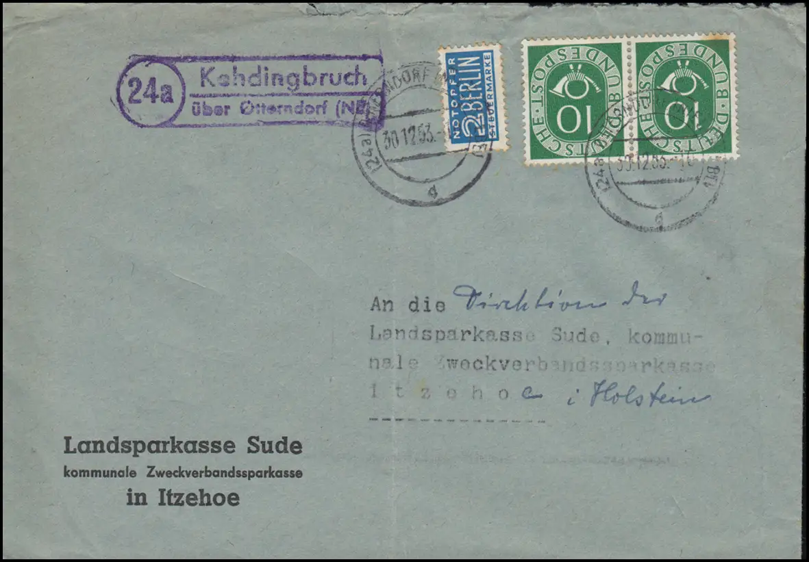 Temple de la poste de campagne Kehdingschrif sur OTTERNDORF (NIDERELBE) 30.12.1953 sur lettre