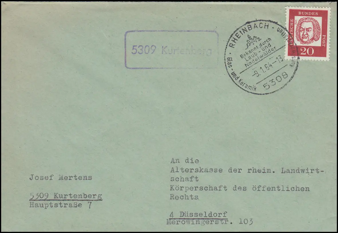 Landpost-Stempel Kurtenberg Brief SSt RHEINBACH Verre et céramique vers Düsseldorf