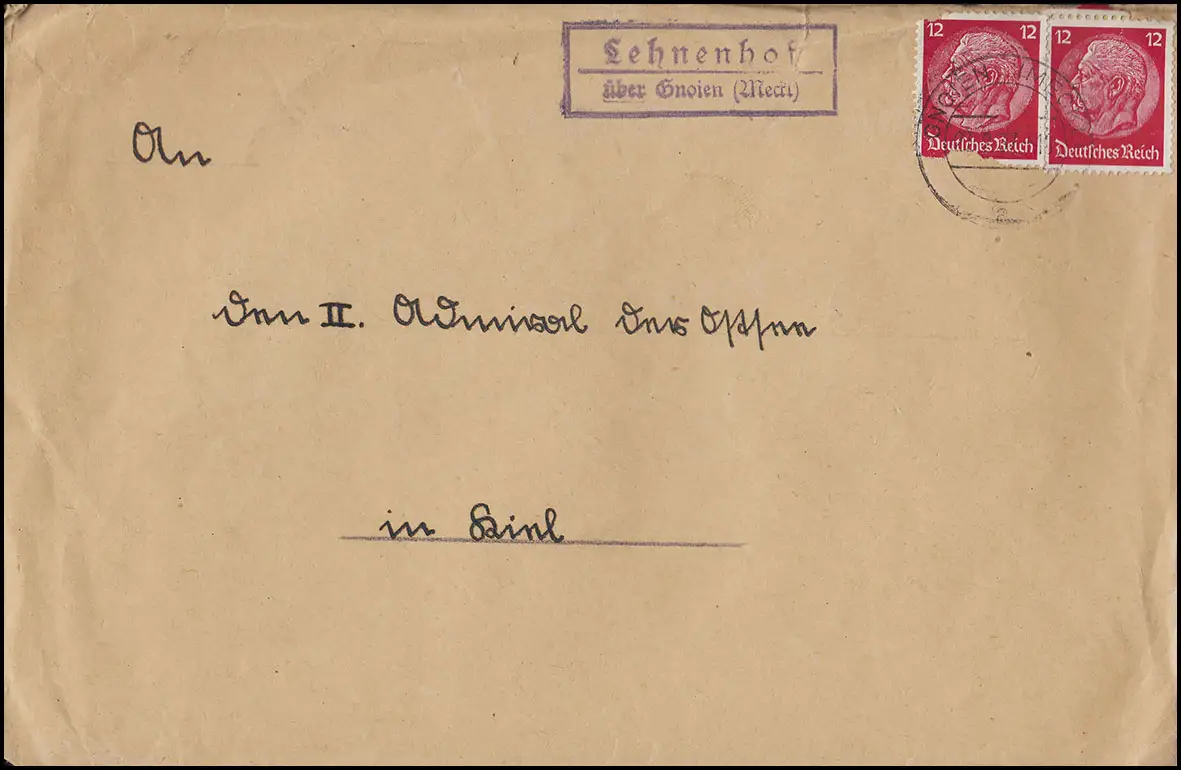 Lehnehof, temple de Landpost, sur GNOIN (MECKL.), lettre 27.2.37