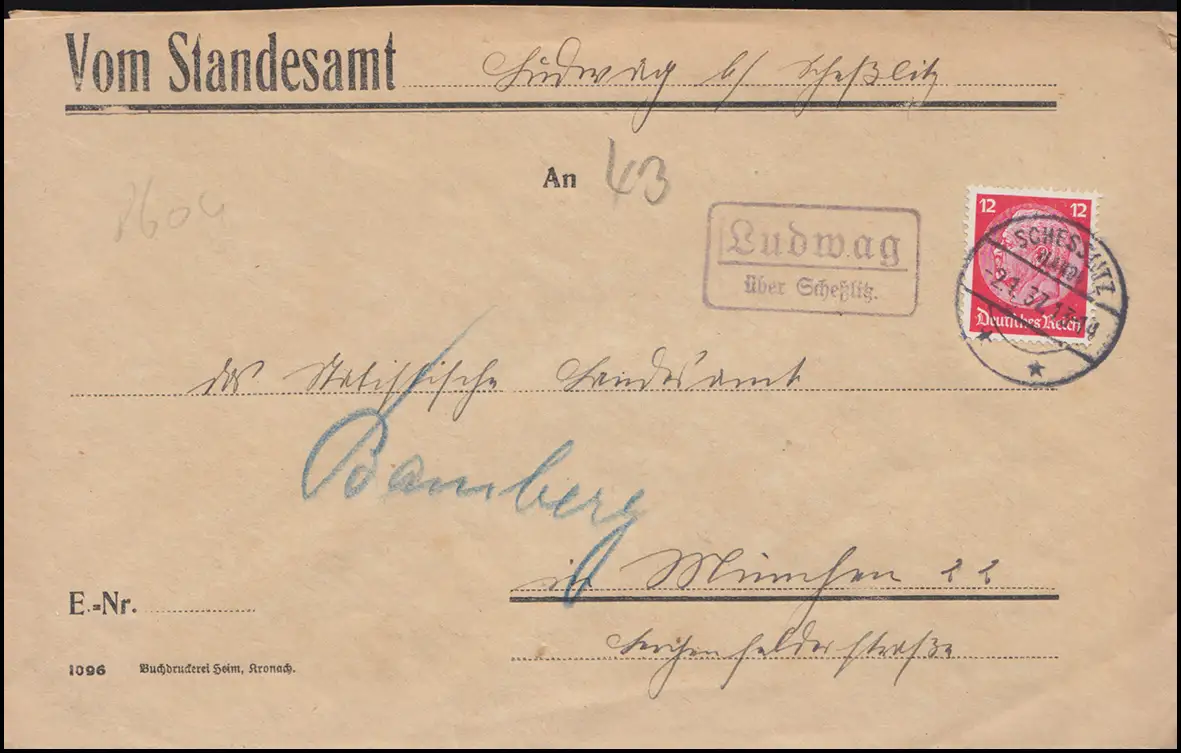 Le temple de Ludwag de la poste de campagne sur SCHESSLITZ (LAND) 2.1.1937 Lettre à Munich