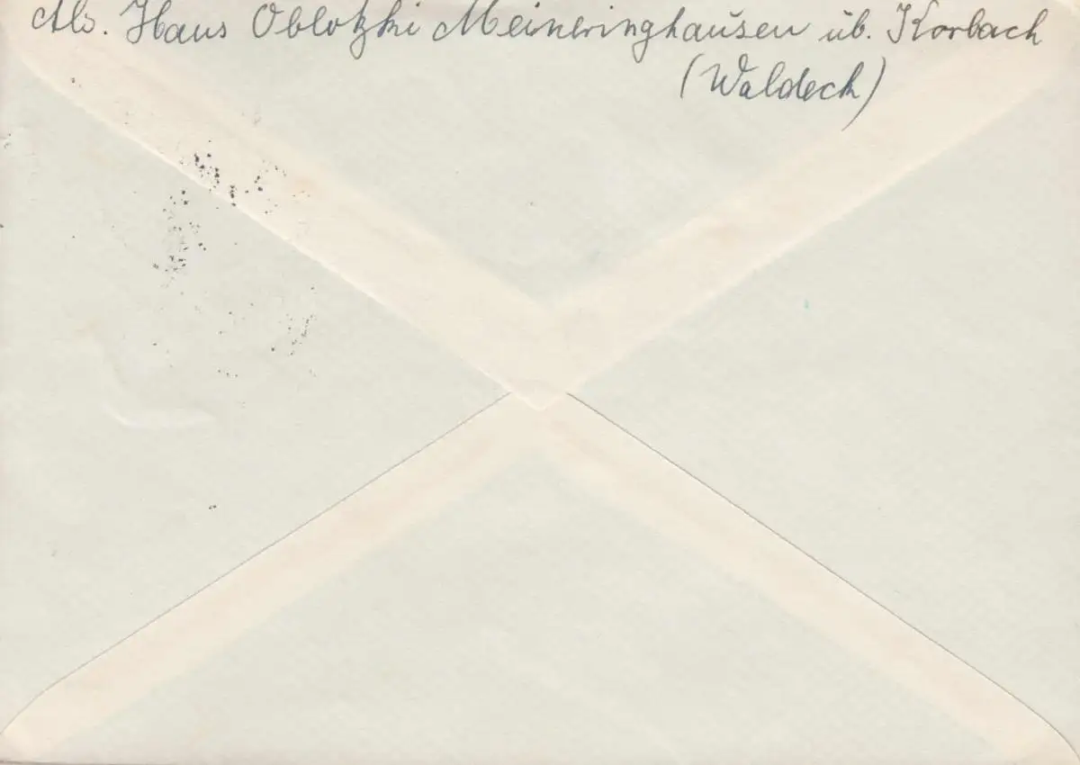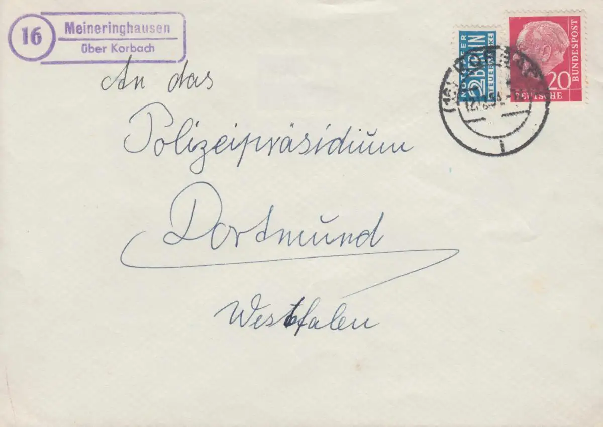 Le temple de la poste de campagne de Meinringhausen sur KORBACH 12.12.1954 sur lettre à Dortmund