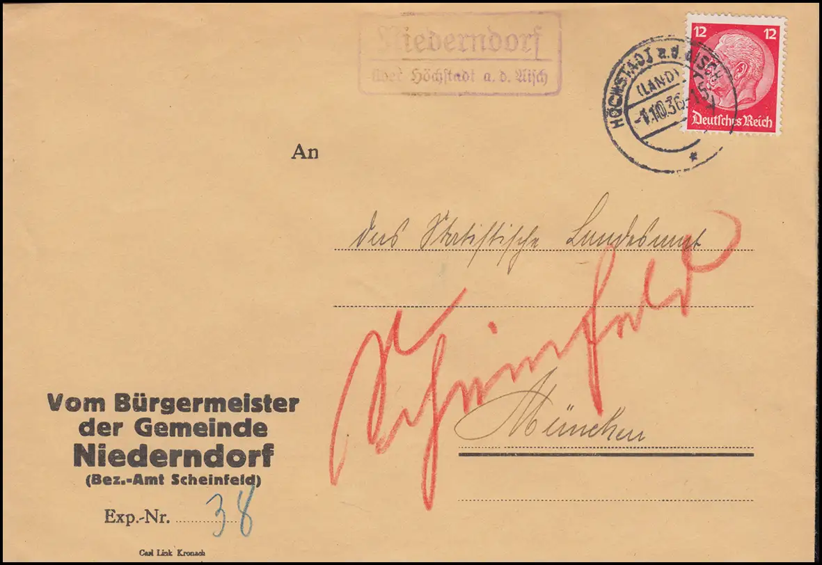 du maire de la commune de Niederndorf (Office Bez.-Freundfeld) à l'Office statistique du Land de Müchen Examen: original Numéro d'article: 00000000041352
