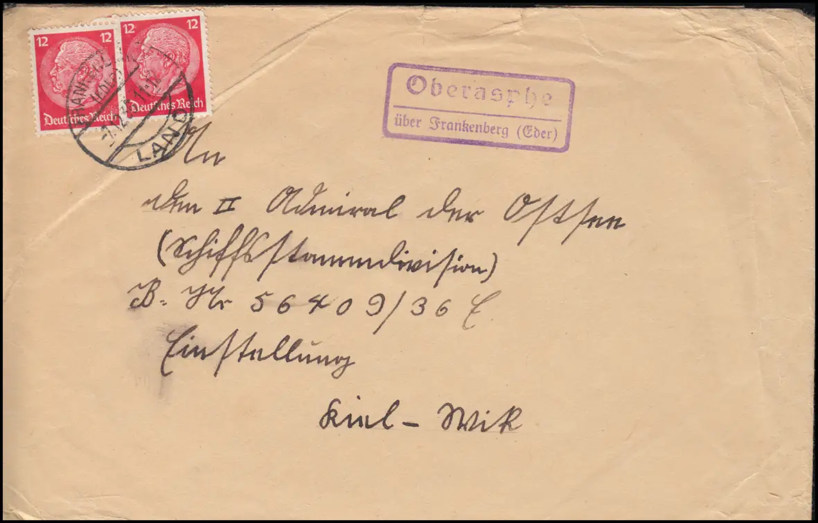 Le temple de la poste de Landpost Oberasphe sur FRANKENBERG (ESDER) LAND 7.12.1936 vers Kiel-Wik