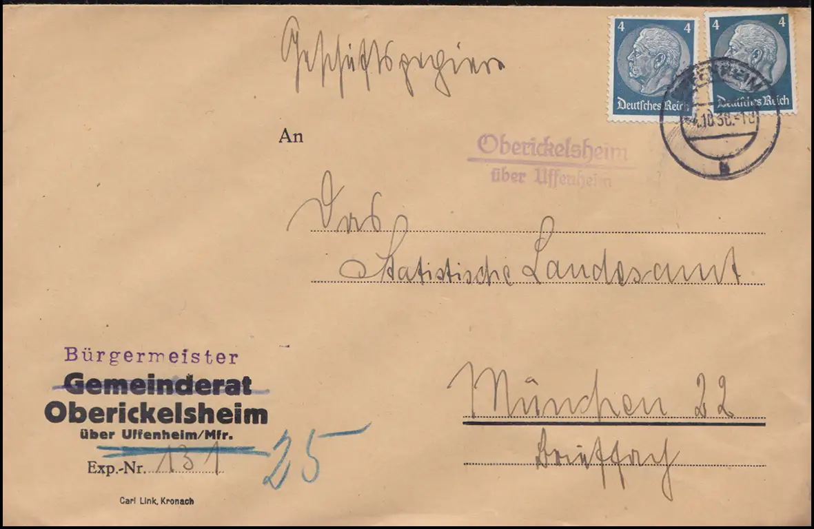 Le temple de Landpost Oberickelsheim sur UFFENHEIM 4.10.1936 sur lettre à Munich