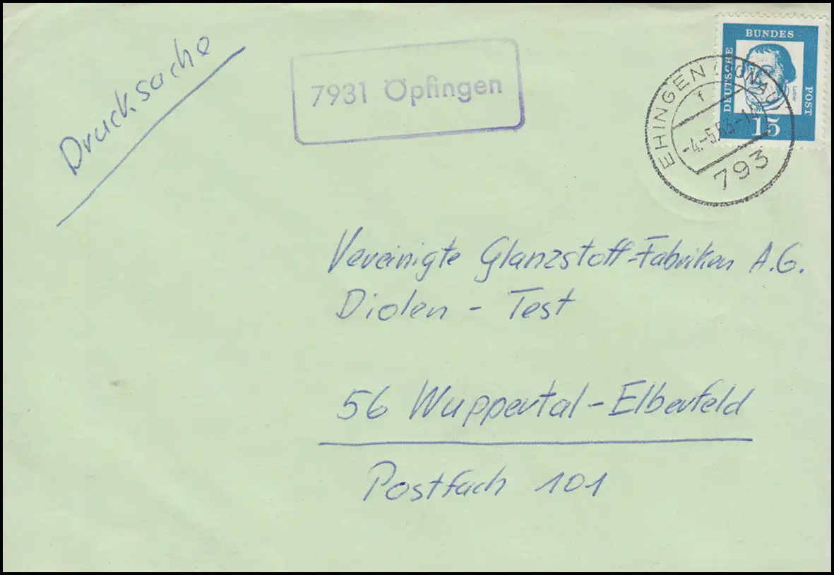 Le temple de la poste de campagne de Öffen Schiffschreibschriften EHINGEN (DONAU) 4.5.1963 n. Wuppertal