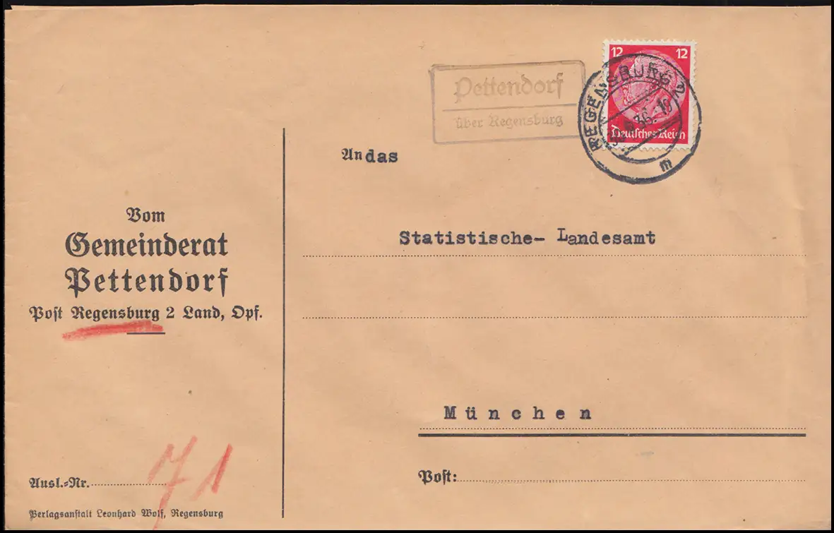 Temple de Pettendorf de Landpost sur REGENSBURG 2 - 30.6.1936 sur lettre à Munich