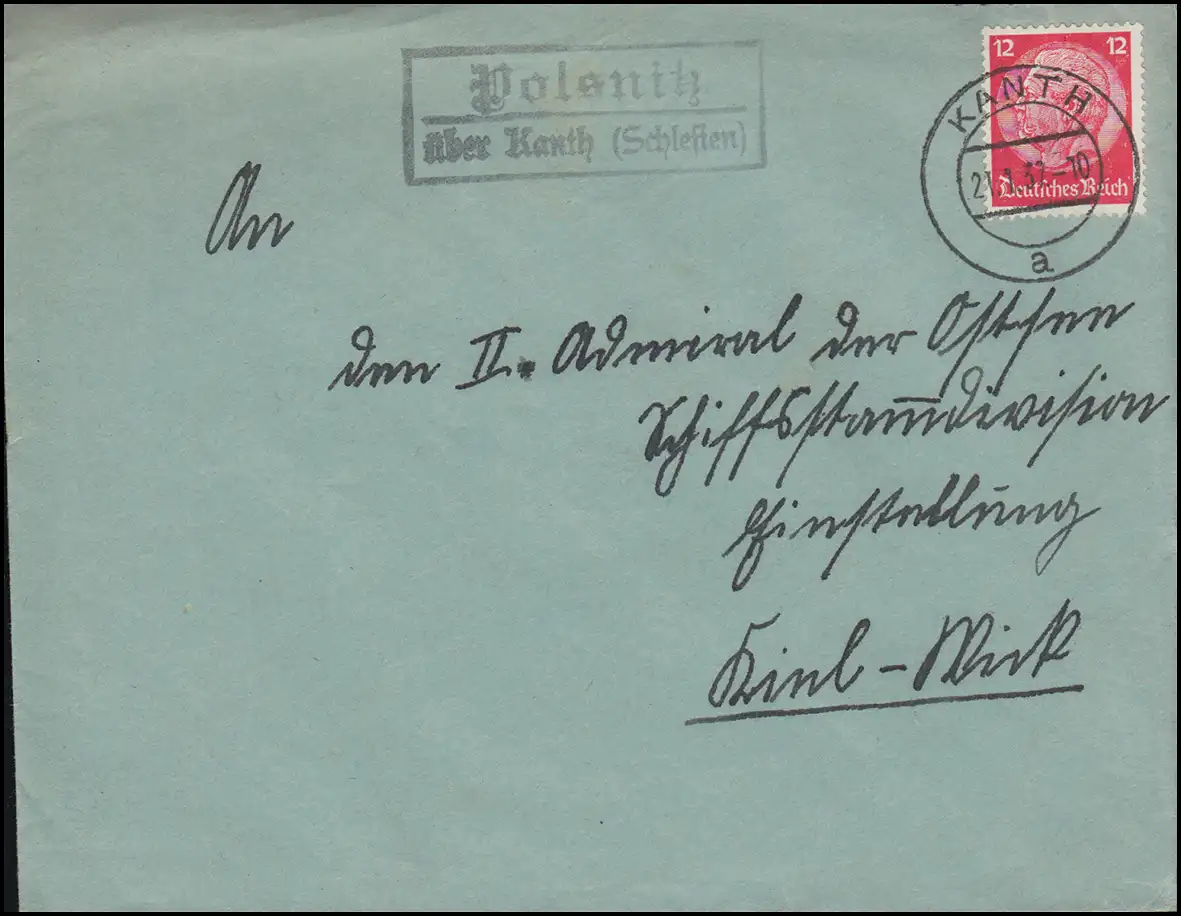 Le temple de la poste de Landpost Polsnitz sur KANTH 21.1.1937 sur lettre à Kiel-Wik