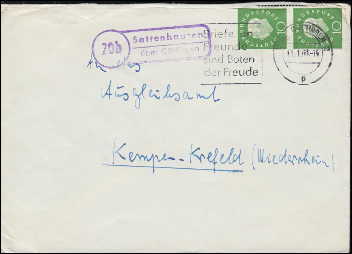 Temple de la poste de Landpost Sattenhausen via GÖTTINGEN 11.1.60 vers Kempen-Krefeld