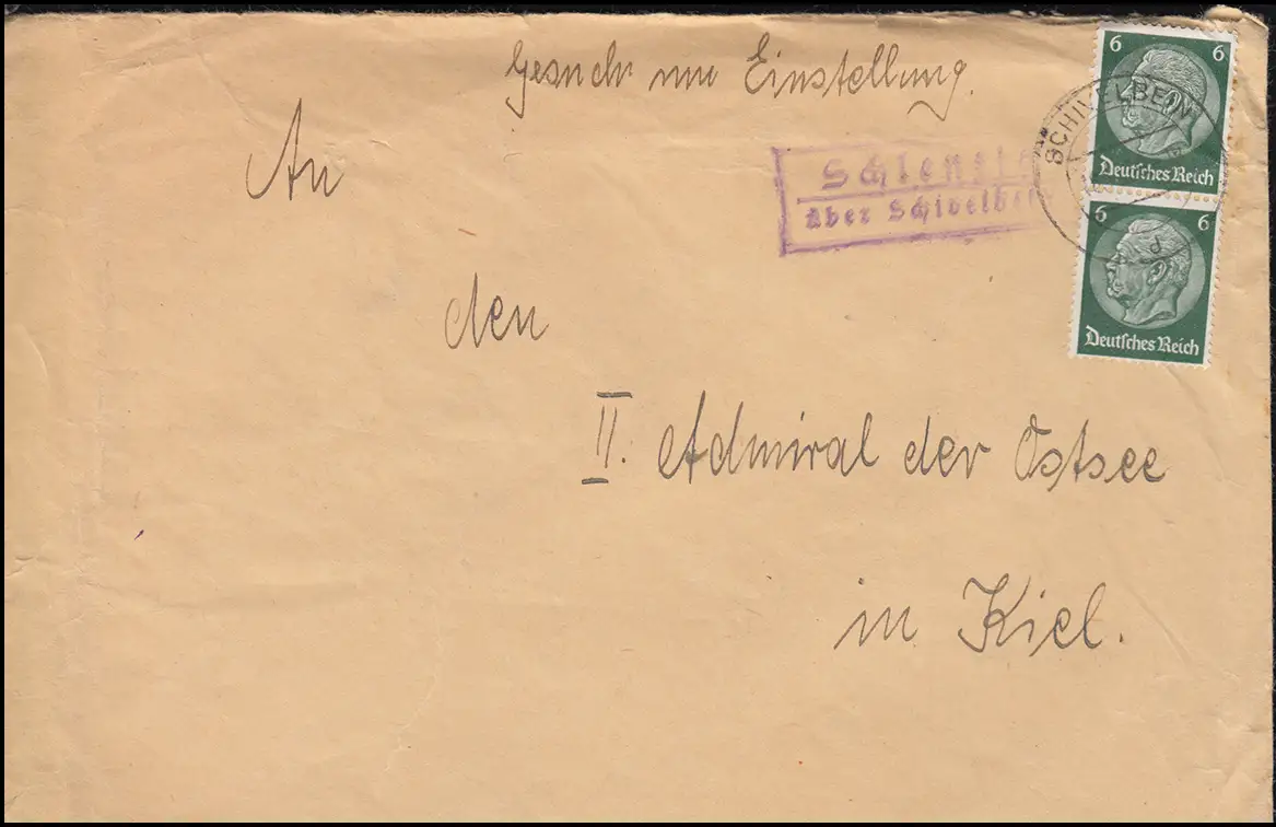 Templier de la poste de campagne Schlenzig sur SCHIVELBEIN 1938 sur lettre après Kiel-Wik