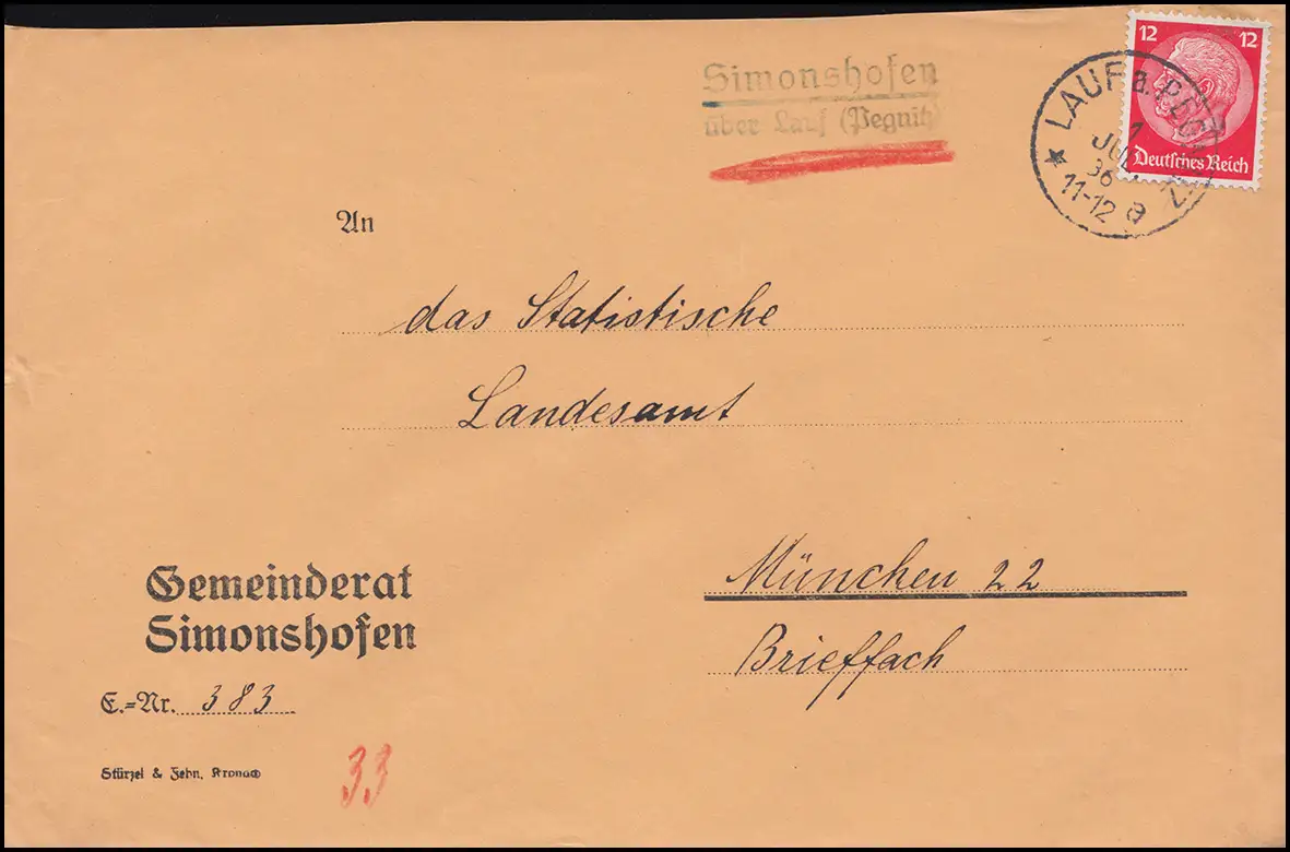 Le temple de la poste de campagne Simonshofen sur le long terme a. PEGNITS 1.7.36 sur lettre à Munich