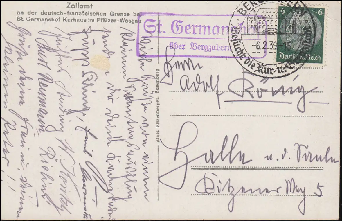 Temple de Landpost St. Germanshof sur le bureau de douane AK approprié, SSt BERGZABERN 6.2.39