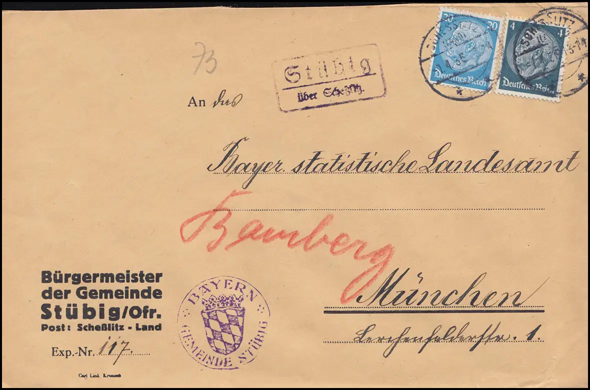 Templier de la poste de campagne Stübig sur SCHESSLITZ (LAND) 1.4.1936 sur lettre à Munich