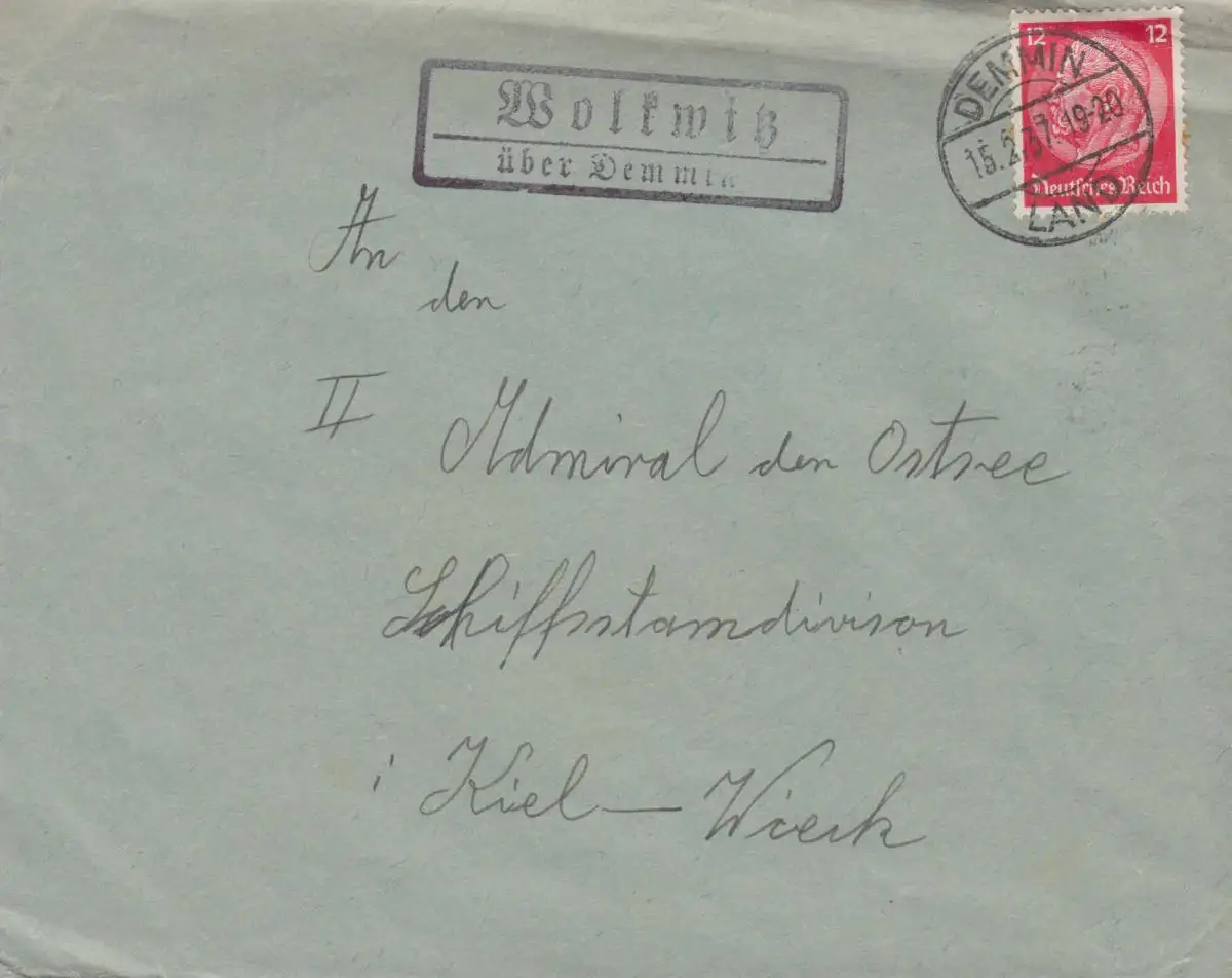 Le temple de la poste de campagne Wolkwitz sur DEMMIN PAYS 15.2.1937 sur lettre anch Kiel
