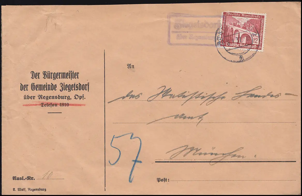 Temple de Landpost de Kietsdorf sur REGENSBURG 2 - 8.1.1937 sur lettre à Munich