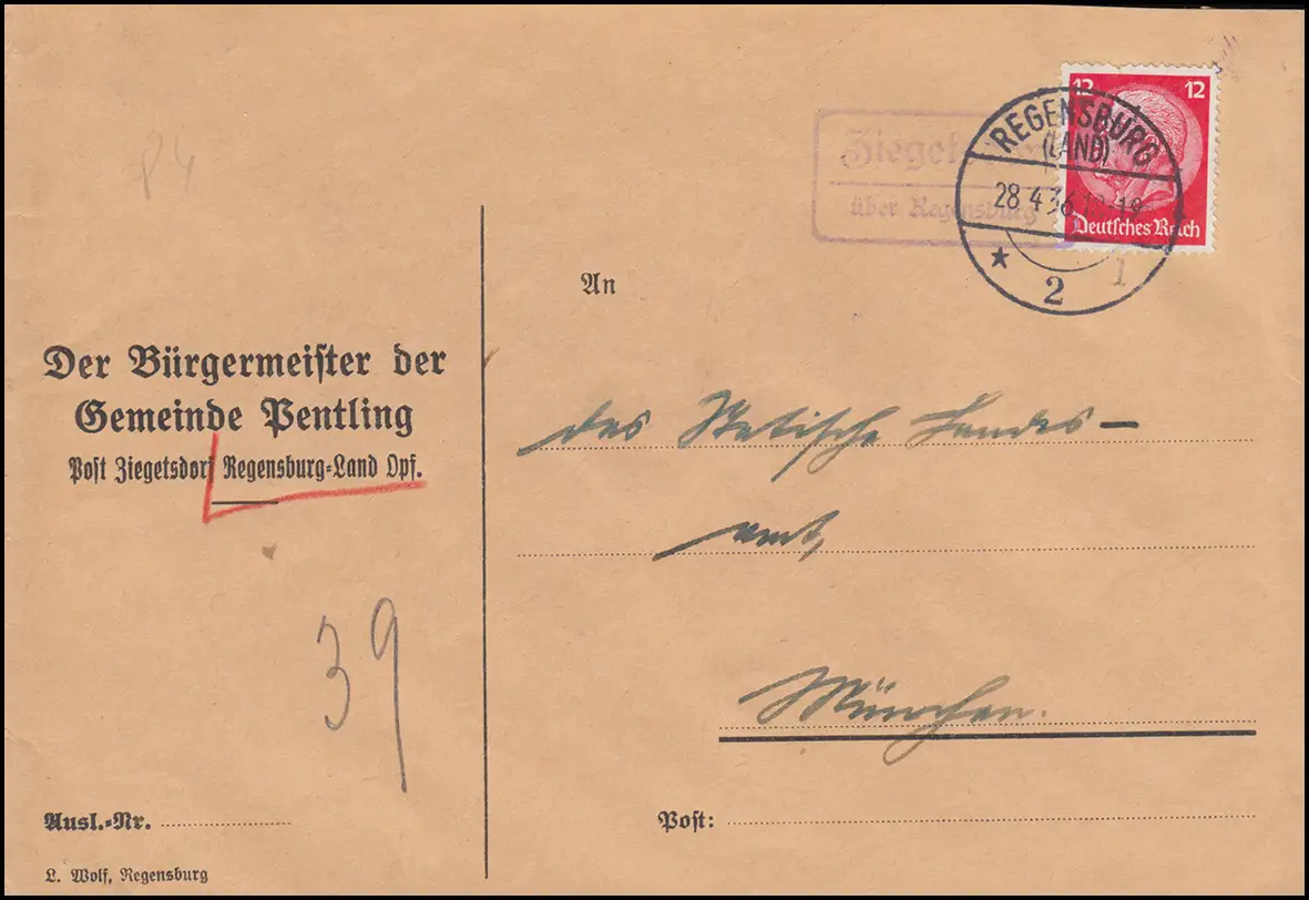 par le maire de la municipalité de Pentling Post Zieitsdorf Regensburg-Land Opf. à l'Office national des statistiques de Munich Examen: original Référence de l ' article: 00000000042646>Note: Cet article n' est disponible qu' une seule fois. Vous recevrez exactement l l\'article représenté.