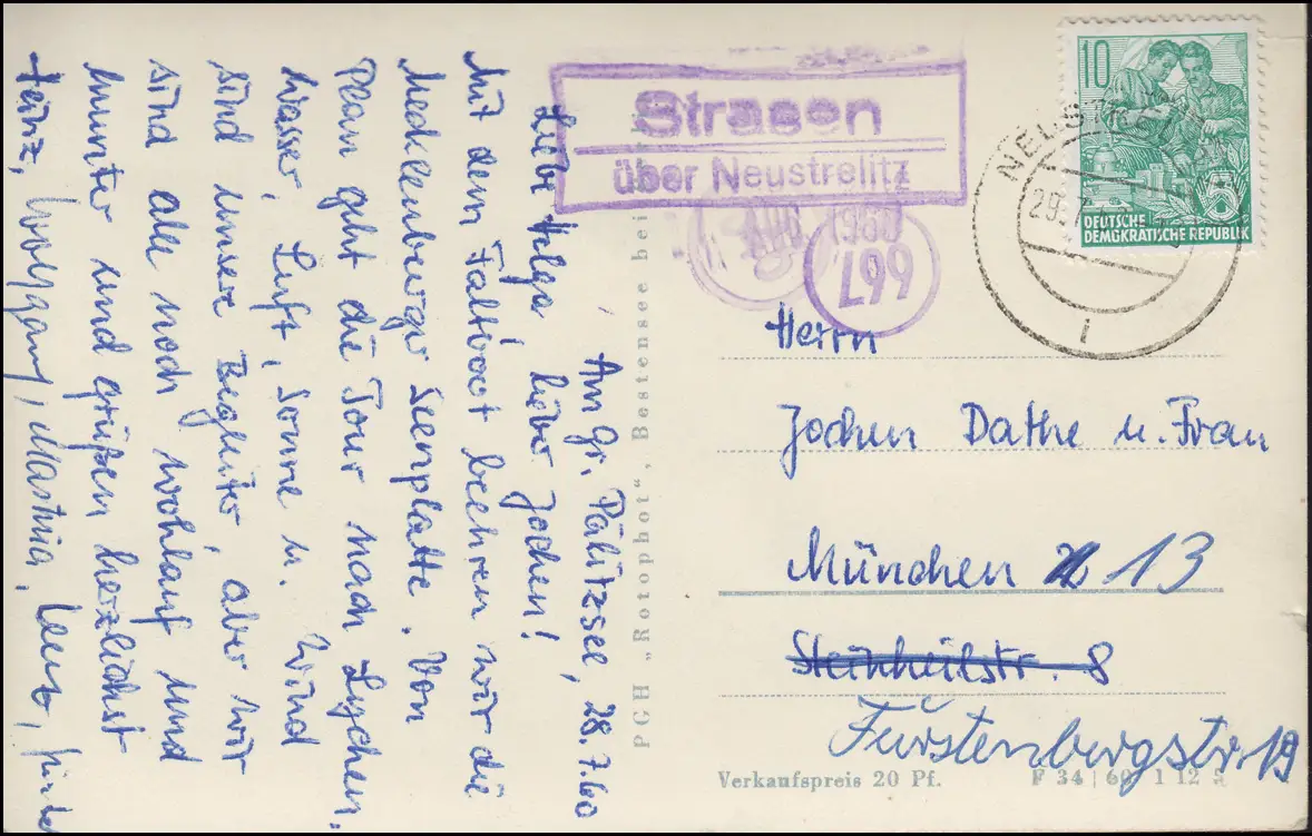 Landpost Strasen sur NEUSTRELITZ 29.7.60 sur AK Waren-Müritz