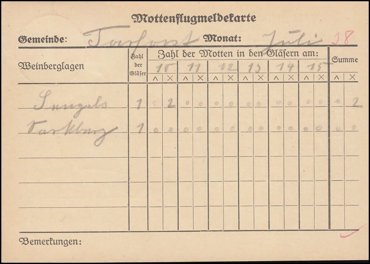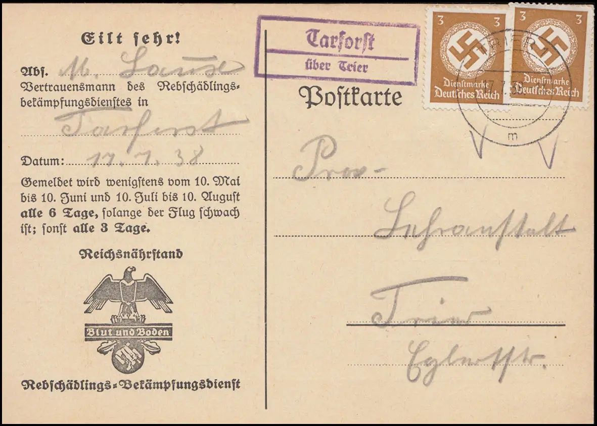 Le courrier terrestre Tarforst sur Trèves sur la carte de vol de Motte, 17.7.38