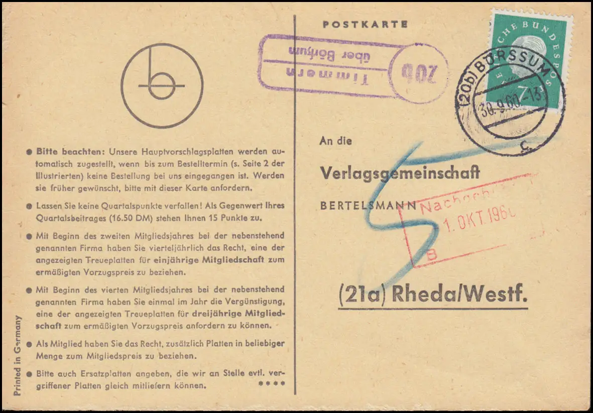 Landpost Timmern sur Börssum 30.9.1960 sur carte postale vers Rheda/Westf.