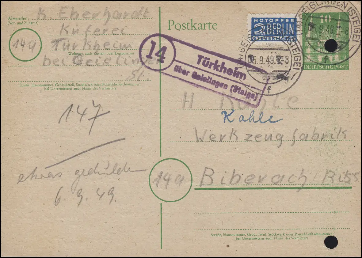 Landpost Türkheim sur GEISKINGEN (STEIGE) 5.9.1949 sur carte postale Bizone P 2I