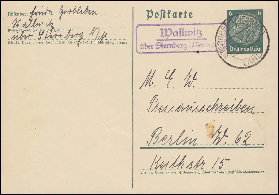 Landpost Wallwitz sur STERNBERG (NOUVELLE MARK) LAND 12.5.36, carte postale vers Berlin