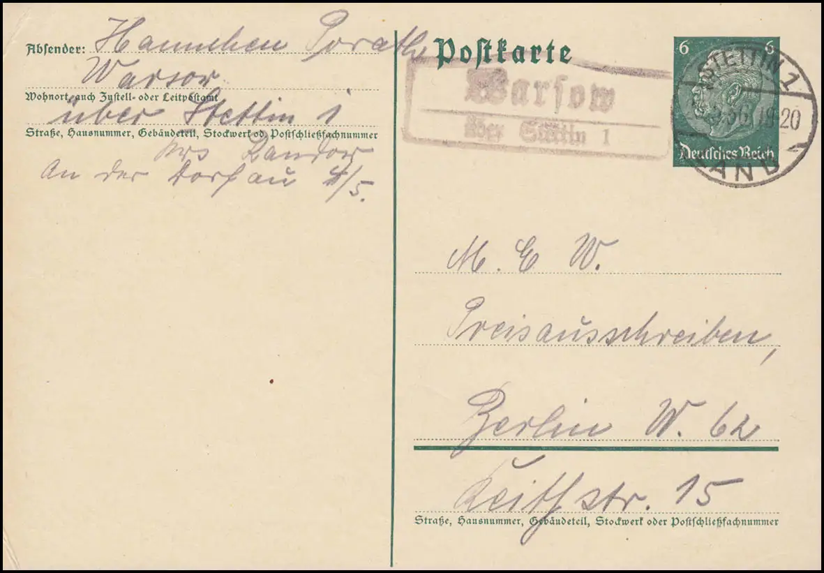 Landpost Warsow via STELTIN 1 LAND 23.5.36 sur carte postale vers Berlin